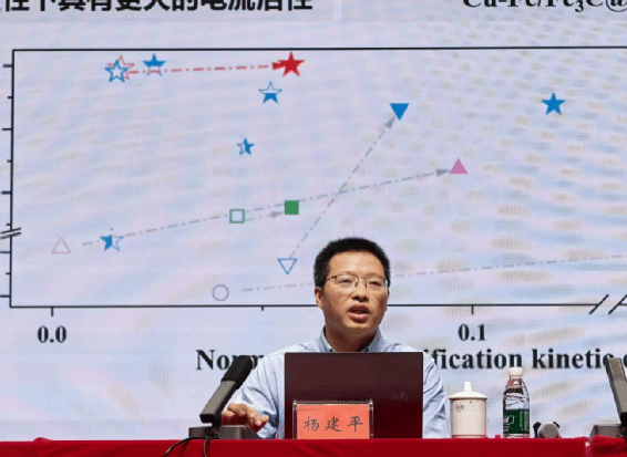 在随后的报告中,杨建平教授围绕“硝酸盐绿色催化”这一前沿科学主题,系统阐述了他的研究团队在该领域的最新探索与深刻思考。针对硝酸盐还原过程中催化剂稳定性差、活性较低、产物调控难等问题提出了核壳结构、铠甲结构等策略,实现了催化材料的结构稳定性提升;发展了双活性位点串联催化、原子制造技术与脉冲技术,提高了电催化还原反应活性;探索了硝酸盐电催化还原与CO2等耦合反应,拓展了产物从氮气到氨、尿素、氨基酸、含硫化合物等。
