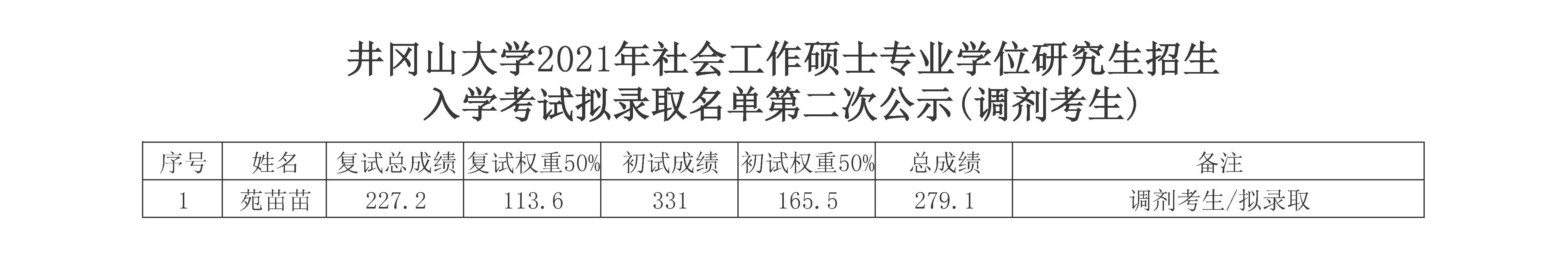 根据教育部、江西省和学校《井冈山大学2021年硕士研究生招生复试录取工作方案》等有关文件精神,根据“候补录 取考生按序替补录取”原则,学校现对候补录取考生的拟录取名单予以公示。
